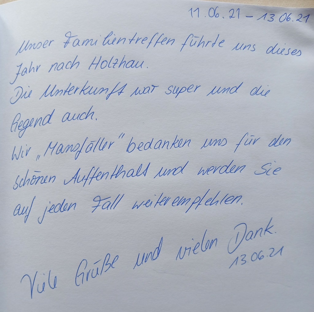Unser Familientreffen führte uns dieses Jahr nach Holzhau. Die Unterkunft war super und die Gegend auch. Wir "Mansfäller" bedanken uns für den schönen Aufenthalt und werden Sie auf jeden Fall weiterempfehlen. Viele Grüße und Vielen Dank.