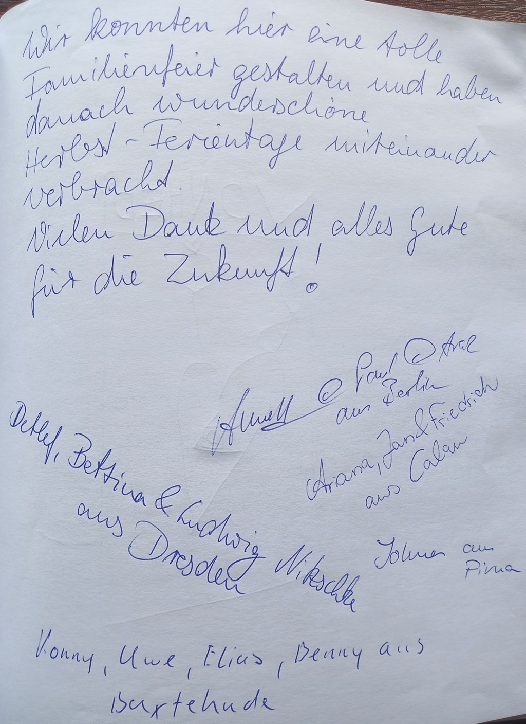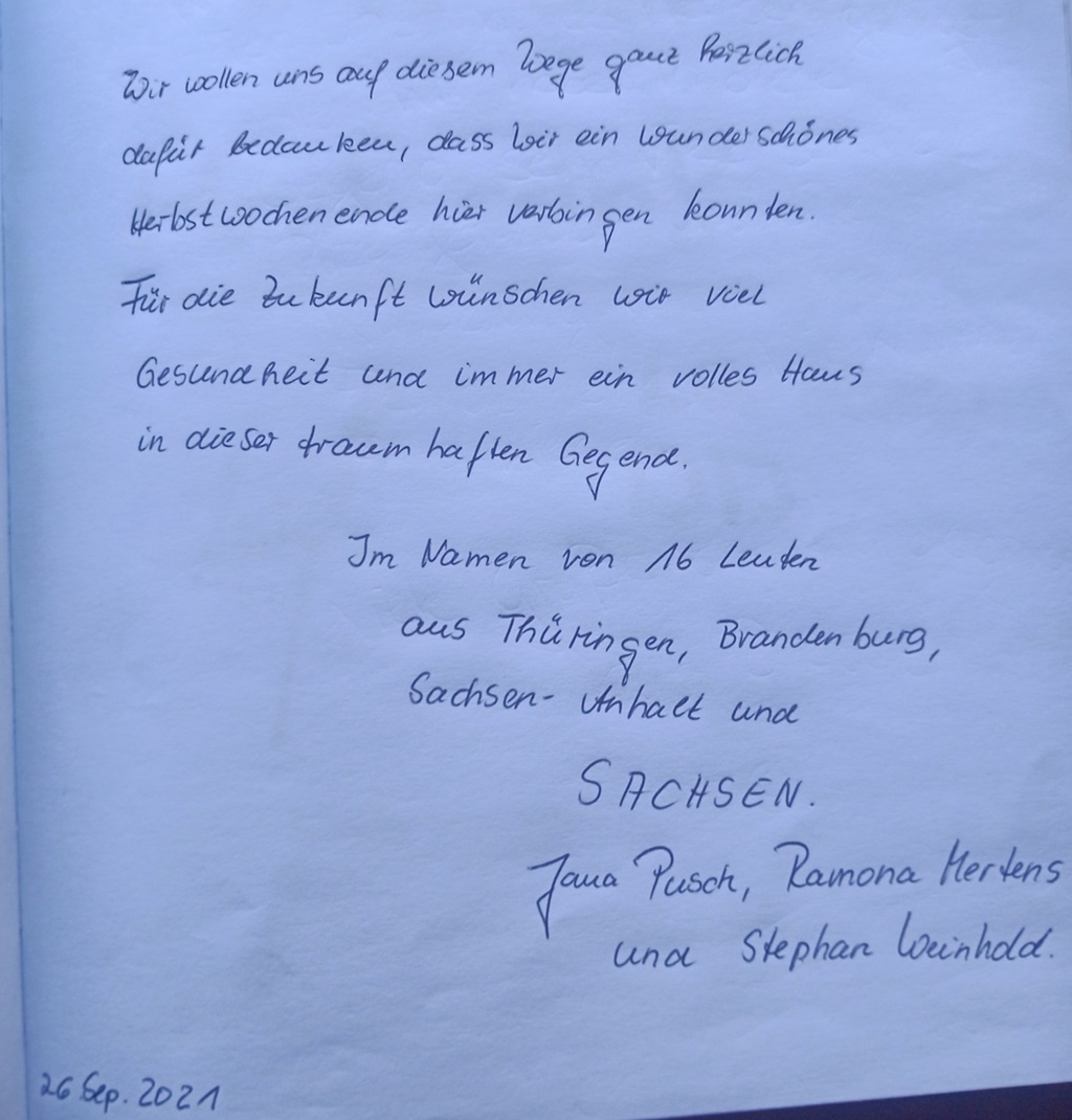 Wir wollen uns auf diesem Wege ganz herzlich dafür bedanken, dass wir ein wunderschönes Herbstwochenende hier verbringen konnten. Für die Zukunft wünschen wir viel Gesundheit und immer ein volles Haus in dieser traumhaften Gegend.