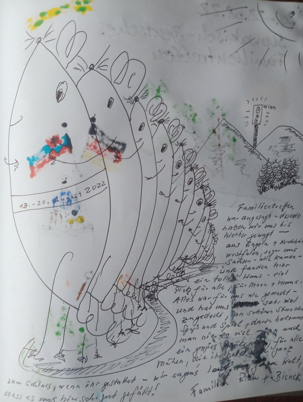 Familientreffen war angesagt - deshalb haben wir uns bis hierher gewagt - aus Bayern + Nordrhein-Westfalen, sogar aus Sachsen - alle kamen - und fanden hier ein tolles Haus - viel Platz für alle, für Mann + Maus. Alles war für uns wie gemacht - und hat uns sehr viel zugedacht, an schönen Stunden, Spaß und Spiel, davon bekommt man nie zu viel - an euch ein großes Dankeschön, für alle Mühen, die ihr hattet und ganz zum Schluss, wenn ihr gestattet - wir sagens' laut der ganzen Welt, dass es uns hier sehr gut gefällt!