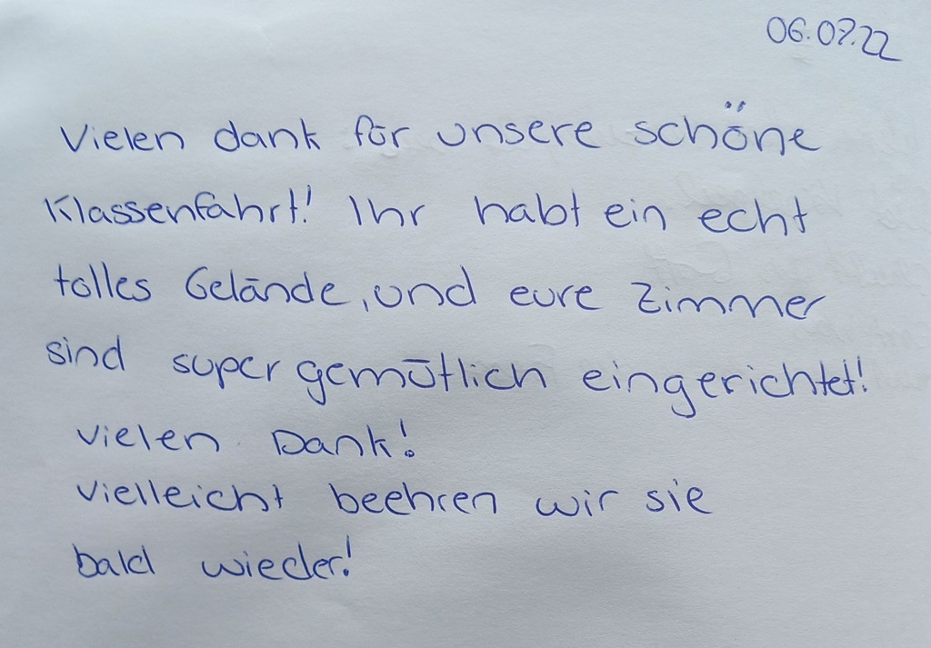 Vielen Dank für unsere schöne Klassenfahrt! Ihr habt ein echt tolles Gelände und eure Zimmer sind supergemütlich eingerichtet! Vielen Dank! Vielleicht beehren wir sie bald wieder!